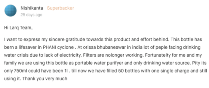 First of all, thank you so much for joining us on this journey! We began this a year and a half ago with little more than a concept. An idea to use design & technology to help people access better drinking water in a more sustainable way. You helped us along the way to make the LARQ Bottle a reality even if there were some bumps along the way. We really could not have done any of this without your support, feedback, patience and generosity. Reading comments like this one form Nishikanta makes us smile:
